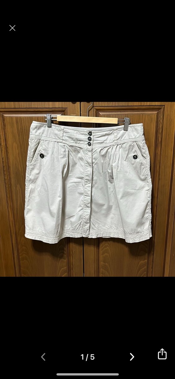 Bej keten mini etek, düğmeli ve bol kesim, gündelik dış mekan kullanımı için uygun.