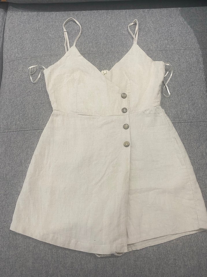 Düğmeli, askılı, krem rengi keten mini tulum, vücuda oturan kesimiyle minimalist bohem tarz sunar, rahat günlük kullanım için uygundur.