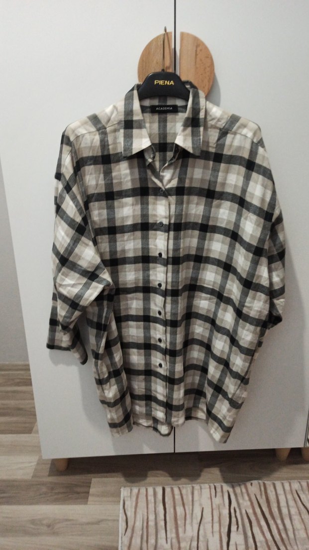 Düğmeli, keten kumaştan salaş kesim, yakalı ve kısa kollu gömlek. Bej ve gri kareli deseniyle günlük rahat kullanıma uygundur.