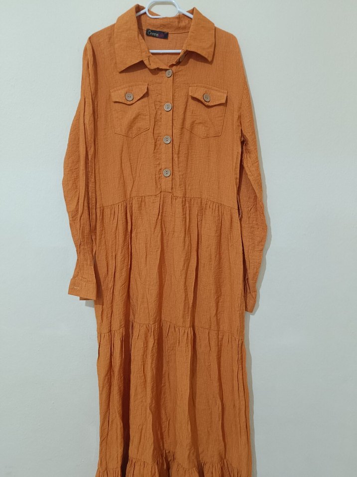 Keten kumaştan yapılmış, düğmeli ve cepli kahverengi uzun elbise. Bol kesim, uzun kollu ve yakası notched lapel. Bohem tarzda, günlük kullanıma uygun.