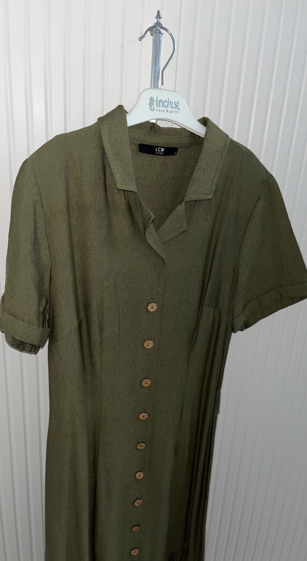 Düğmeli, kısa kollu, V yakalı keten kumaştan yapılmış, bol kesim uzun elbise. Rahat ve gündelik sokak stili için uygundur.