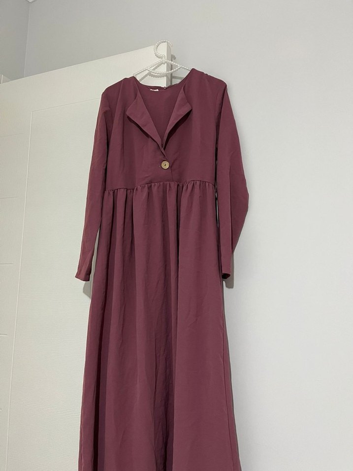 Keten kumaştan, düğmeli ve yakası notched lapel olan uzun, bol kesim elbise. Minimalist tarzda, günlük kullanıma uygun.