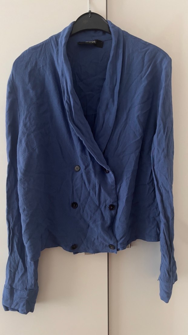 Düğmeli, keten kumaştan, notched lapel yakalı ve bol kesim lacivert gömlek, ofis için minimal tarz sunar.