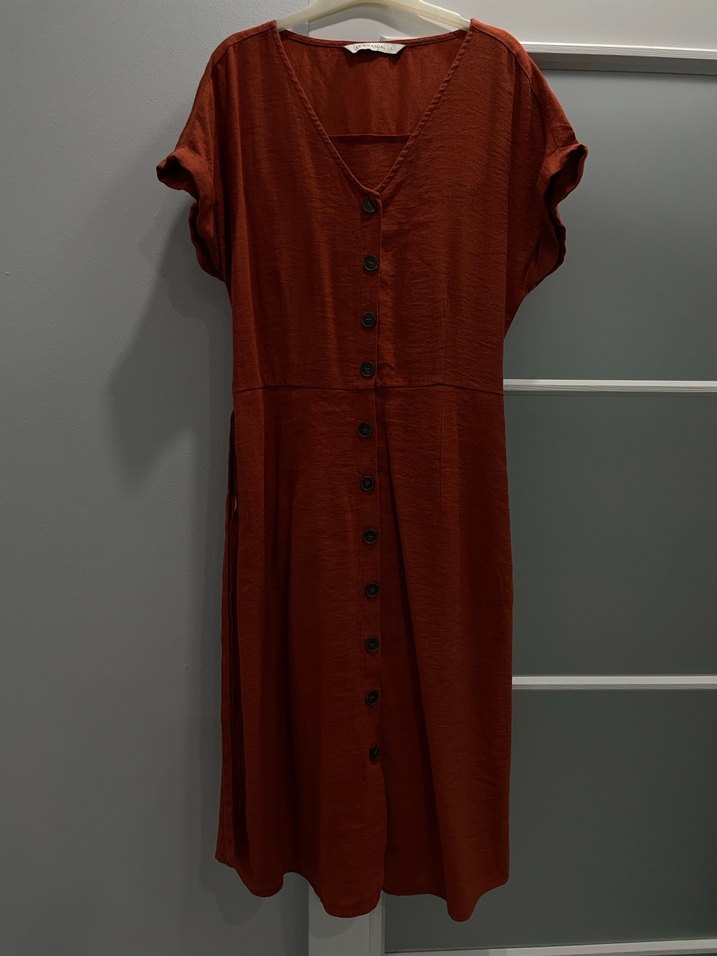 Keten kumaştan, kısa kollu, V yakalı ve düğmeli uzun kahverengi elbise. Rahat kesimi ve minimal bohem tarzıyla dikkat çeker.