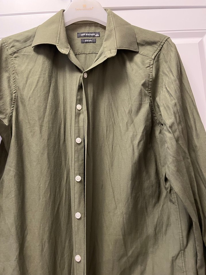 Düğmeli, parlak görünümlü khaki keten erkek gömlek, notched lapel yaka ve uzun kolludur. Normal boyda ve regular fit olup ofis kullanımına uygundur.