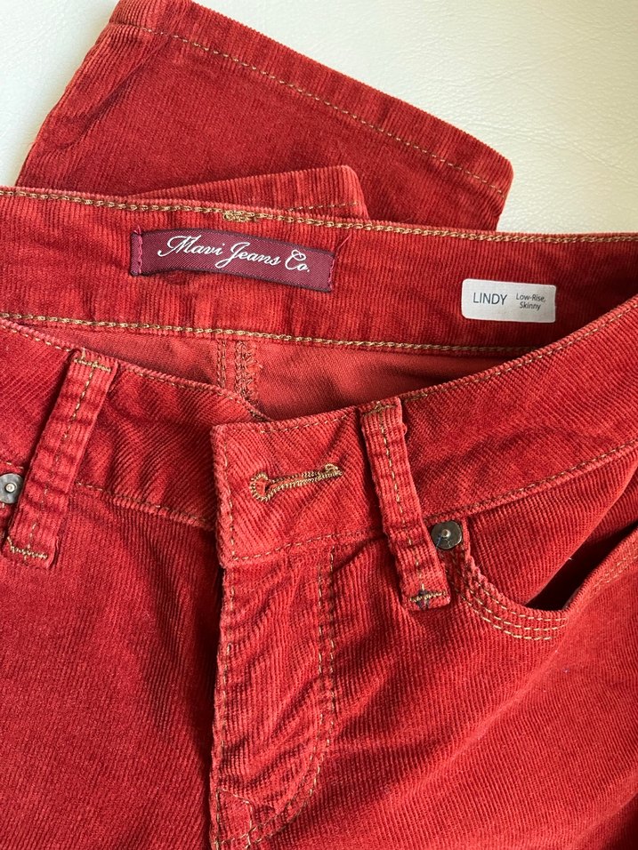 Mavi Jeans Lindy markalı, düğmeli önü ve kiremit renkte, normal kalıp kadın kadife pantolon. Günlük kullanım için uygundur. 26-30 bedendir