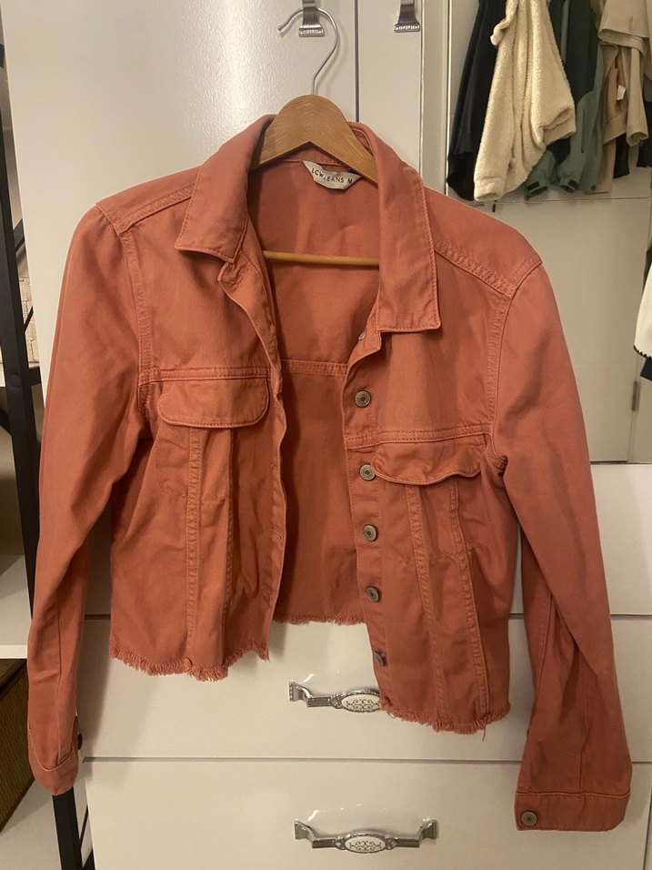 Kiremit renkli, düğmeli ve loose fit kesime sahip kadın kot ceket. Uzun kollu, yakası notched lapel ve parlak keten kumaştan üretilmiştir.
