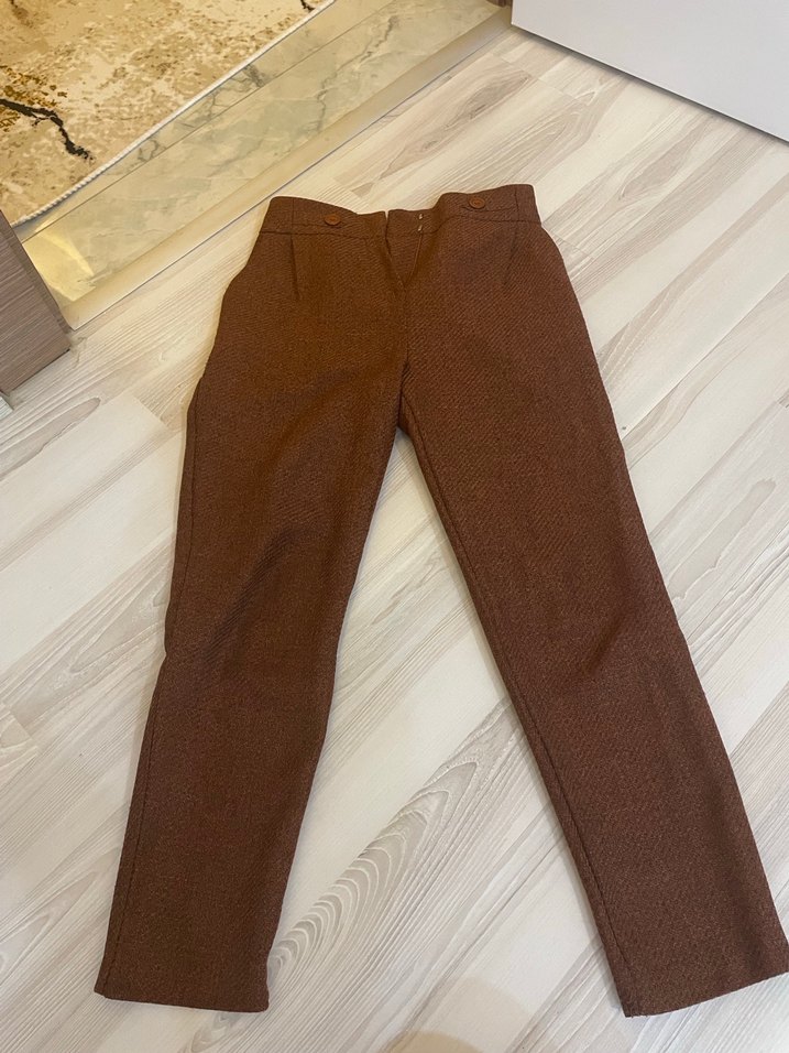 Kahverengi düğmeli kadın kumaş pantolon, normal boy midi kesim ve rahat kalıpla. Günlük kullanıma uygun sade ve konforlu streetwear tarzında.
