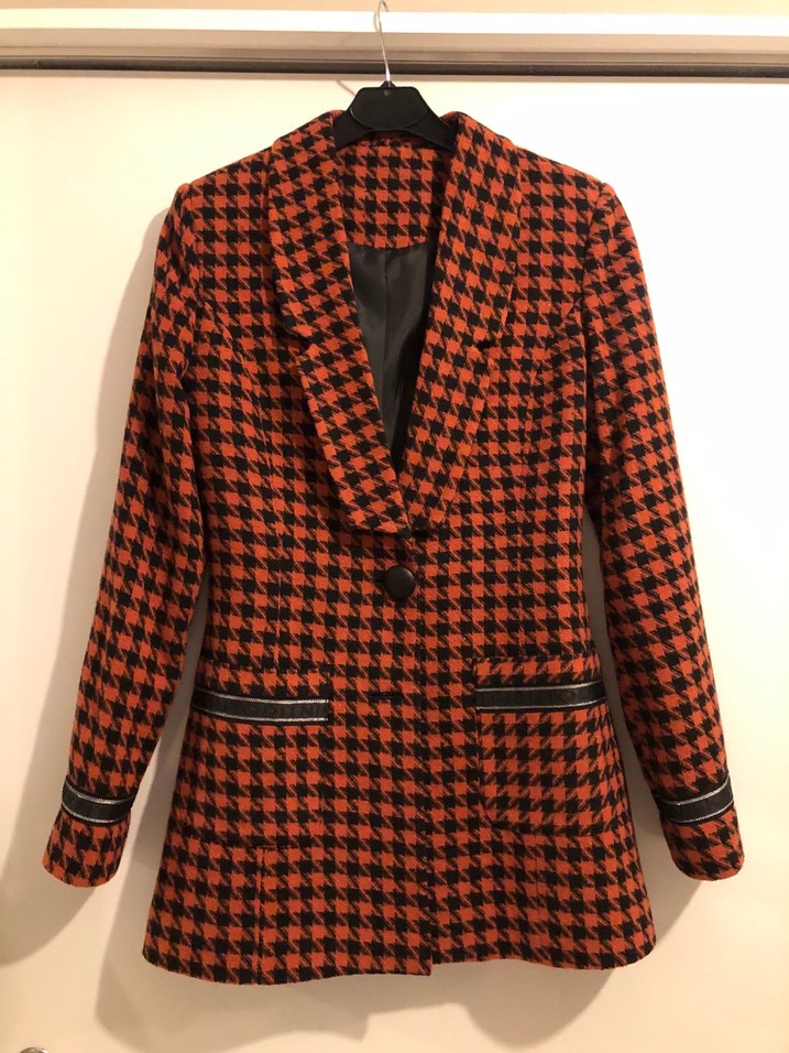 Düğmeli, kiremit rengi kazayağı desenli kadın ceket, uzun kollu ve normal kesimdir. Ofis için uygun, midi boyda ve fermuarlı ceplidir.