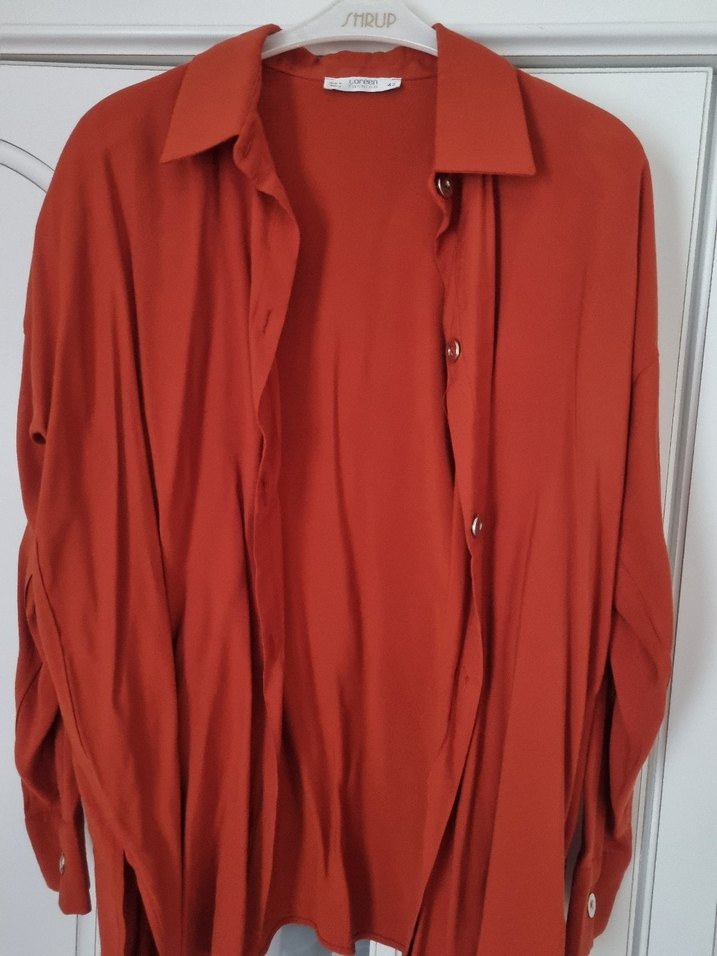 Düğmeli ve uzun kollu, bol kesim kadın gömlek. İpek dokulu kumaştan, normal midi boyda, kiremit renkte. Minimalist ve sokak stiline uygun, günlük kullanıma ideal.