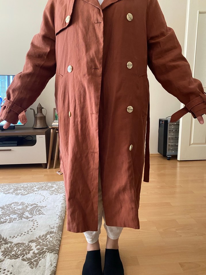 1-2 defa giyildi 38-40 beden uyumlu. Bol kesim, kiremit rengi kumaştan, uzun kollu ve yakalı düğmeli midi trençkot, günlük kullanım için uygun.
