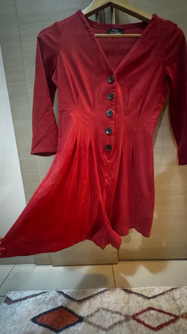 Bu kırmızı süet midi tulum , uzun kollu ve V yaka tasarıma sahiptir. Düğme detayları ve bol kesimiyle bohem vintage tarzını yansıtır, günlük kullanıma uygundur.