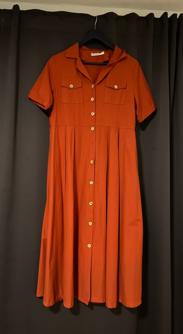 Düğmeli kiremit rengi keten uzun elbise, yakalı ve kısa kolludur. Salaş kesimi ve minimalist bohem tarzıyla günlük kullanıma uygundur.