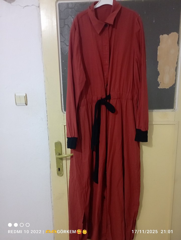 Düğmeli, uzun kollu, bol kesim kadın elbisesi. onu düğmeli. kiremit renginde rahat bir elbise.