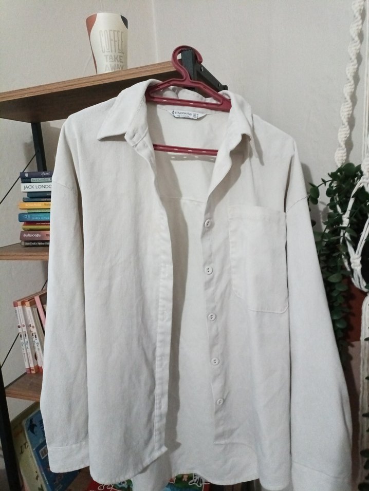 Beyaz fitilli kumaştan, düğmeli, uzun kollu, yakası kesik detaylı, bol kesim kadın gömleği. Minimalist sokak stili için uygundur.