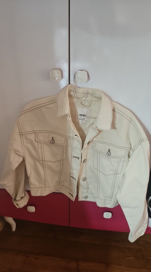 Düğmeli kırık beyaz pamuk kot ceket,Salaş kesim ve midi boyda. sadece 1 kere bayramda giydim. eski sezondur. rengi krem-kırık beyaz arası. hiçbir kusuru yok. oversize kalıp olduğu icin 36 bedene oluyor