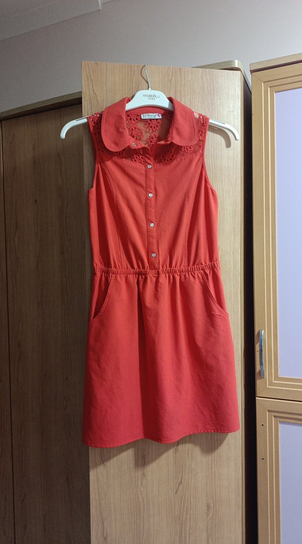 Düğmeli, yakalı ve kolsuz bu kırmızı midi elbise, arkasında dantel detayli denedi sadece. FİYATTA YARDIMCI OLURUM.