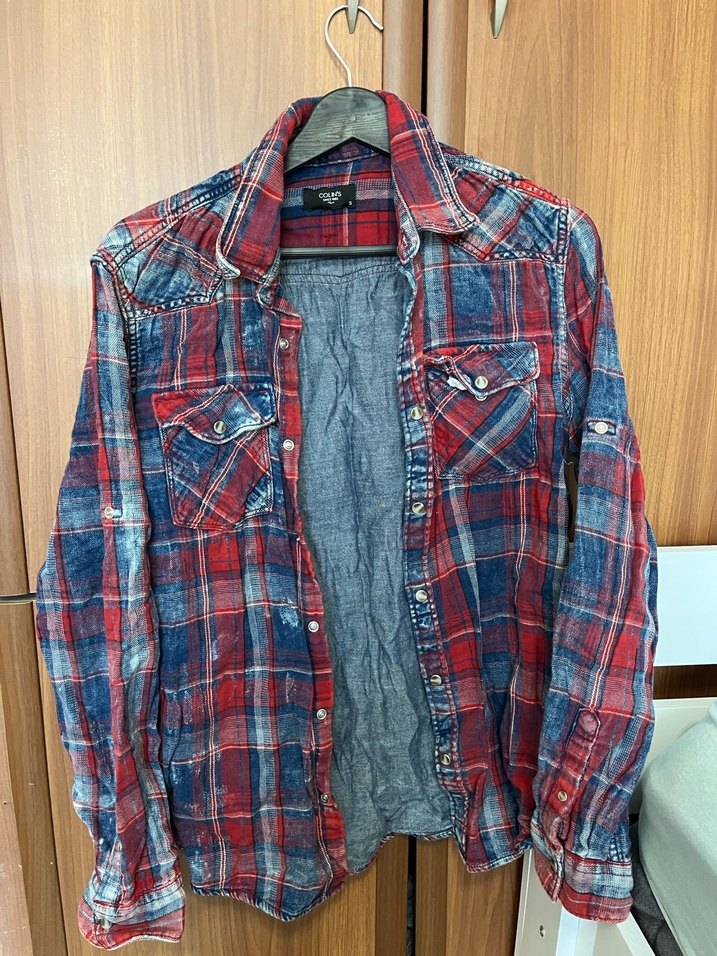 Kırmızı denim gömlek, uzun kollu ve düğmeli, bol kesimdir. Batik desen ve notched lapel yaka, günlük rahat sokak stiline uygundur. Defo yok