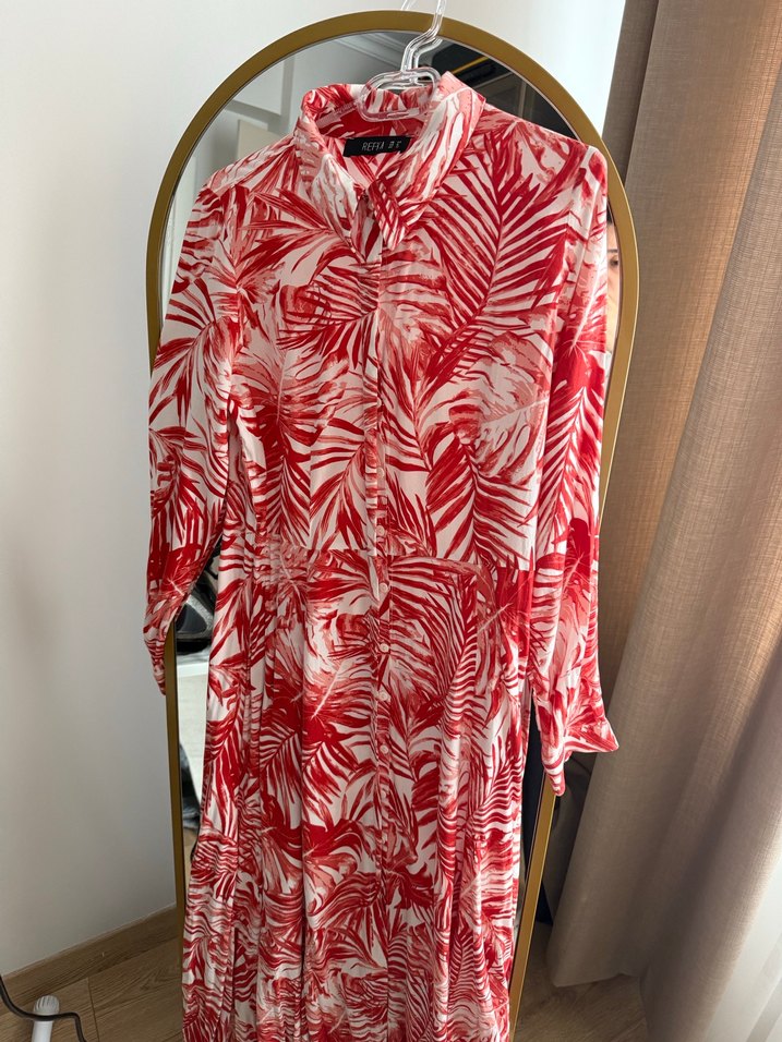 Parlak kırmızı batik desenli, uzun kollu ve yüksek yakalı bu uzun elbise, düğmeli ve bol kesimdir. Pürüzsüz sentetik kumaştan, bohem tarzı için uygundur.