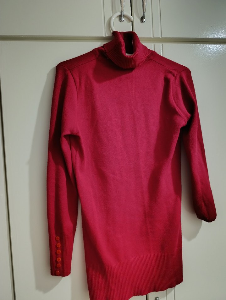 Düğmeli kolları ve boğazlı yakası olan, normal midi uzunlukta, yumuşak ve sıcak kumaştan kırmızı, vücuda oturan kadın kazak.