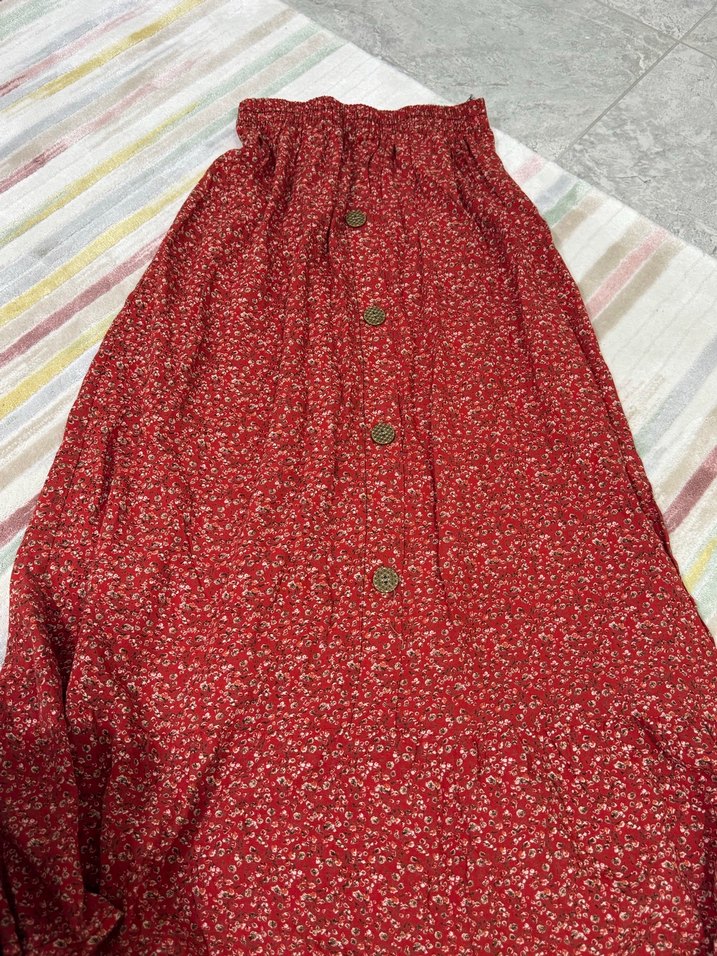 Bu uzun kırmızı midi etek, ön kısmında düğmelerle bol kesim ve sentetik kumaştan yapılmıştır. Günlük kullanıma uygun bohem tarzını yansıtır.