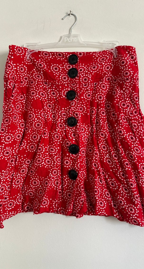 Kırmızı mini etek, koyu bağlama desenli ve önünde siyah düğmeler bulunur. Bol kesimli, yumuşak dokulu kumaştan yapılmıştır. Günlük kullanıma uygundur. Yan cep detaylı