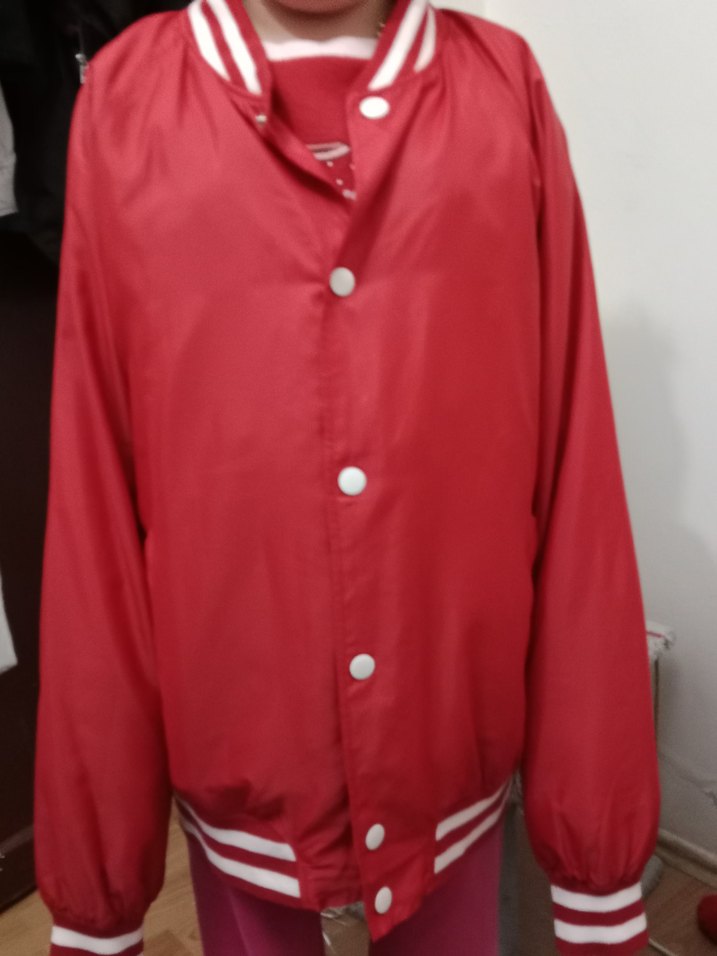 Parlak kırmızı renkte, düğmeli ön kapamalı ve uzun kollu ceket. Rahat kesimli, bisiklet yakalı ve sentetik kumaştan, günlük rahat stil için uygundur.