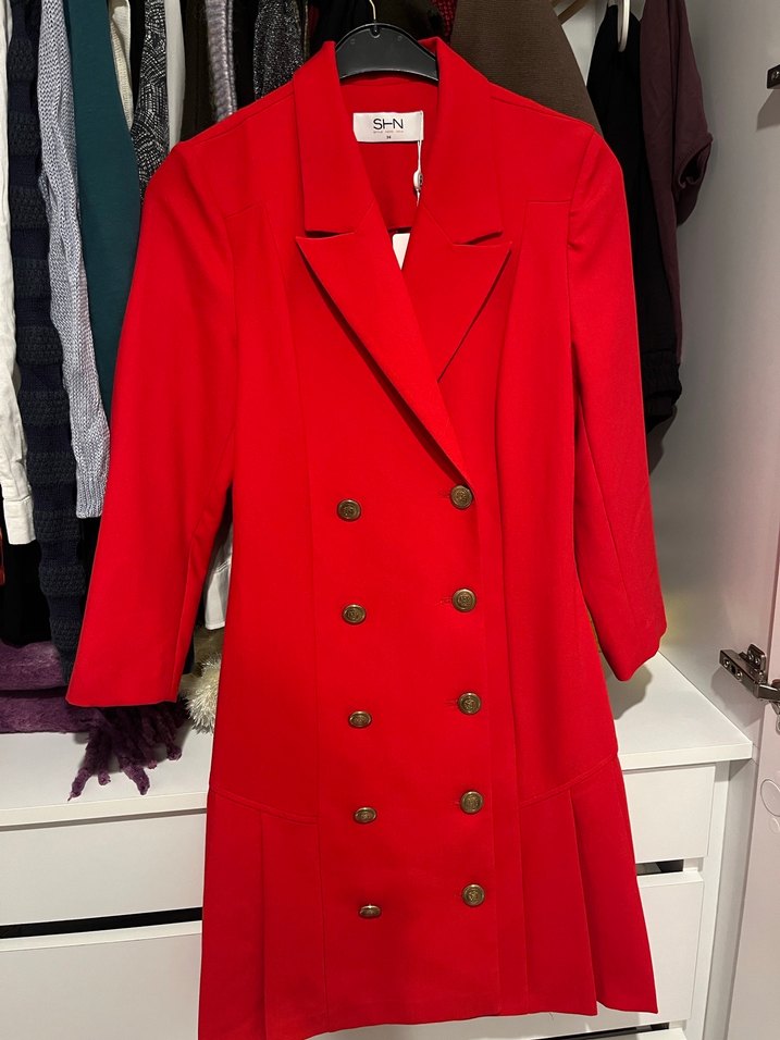 Düğmeli, kırmızı, uzun ve fitted kesim kaban. Yumuşak ve sıcak kumaştan üretilmiş, klasik şıklık ve ofis kullanımı için uygun. 36 Beden- Etiketli- Hiç Kullanılmadı