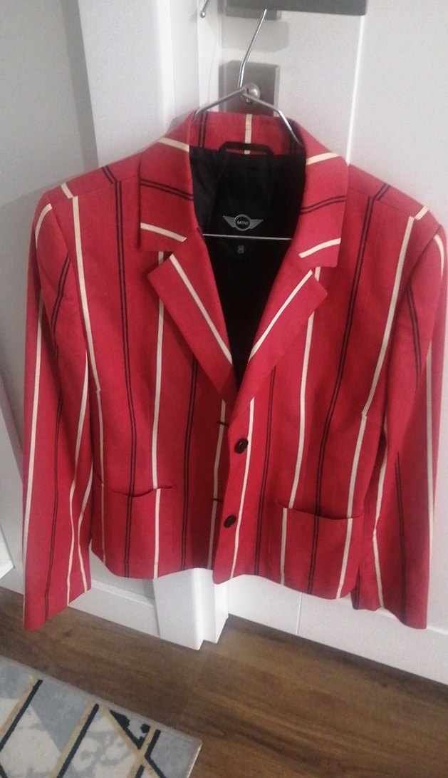 Düğmeli, yakası kesimli, uzun kollu kırmızı çizgili, astarlı, fit