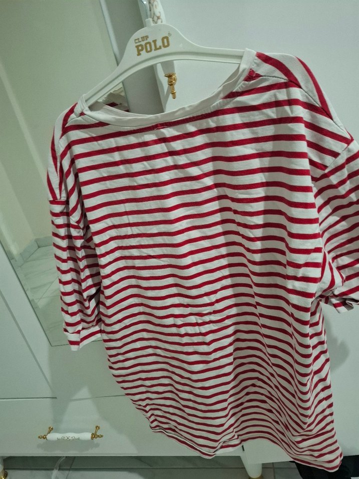 Pamuk kumaştan, düğmeli ve kısa kollu, kırmızı çizgili, bol kesim hamile tişörtü. Günlük rahat kullanım için uygundur.