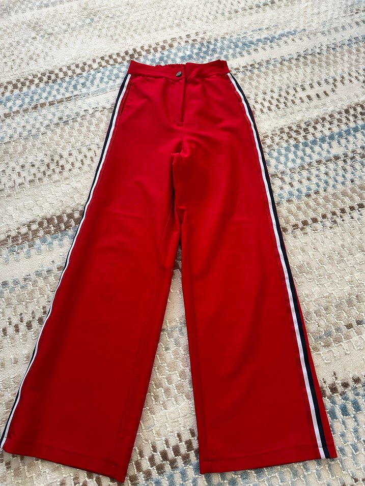 Düğmeli, çizgili yanları olan kırmızı kadın pantolonu, rahat kesim ve uzun boylu, yumuşak sentetik kumaştan üretilmiştir. Defolarını belirttim yakından bakmadığınız sürece görmesi zor asla belli olmuyor yıllardır dolapta giymediğim için satıyorum boy 105 cm bel 32 cm ama lastikli