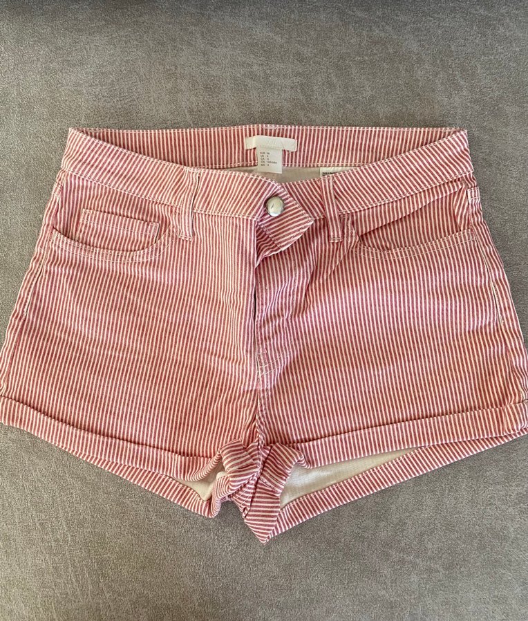 Pamuklu, kırmızı beyaz çizgili, düğmeli ve dar kesim mini kadın şort, sokak tarzı ve açık hava kullanımı için uygundur.