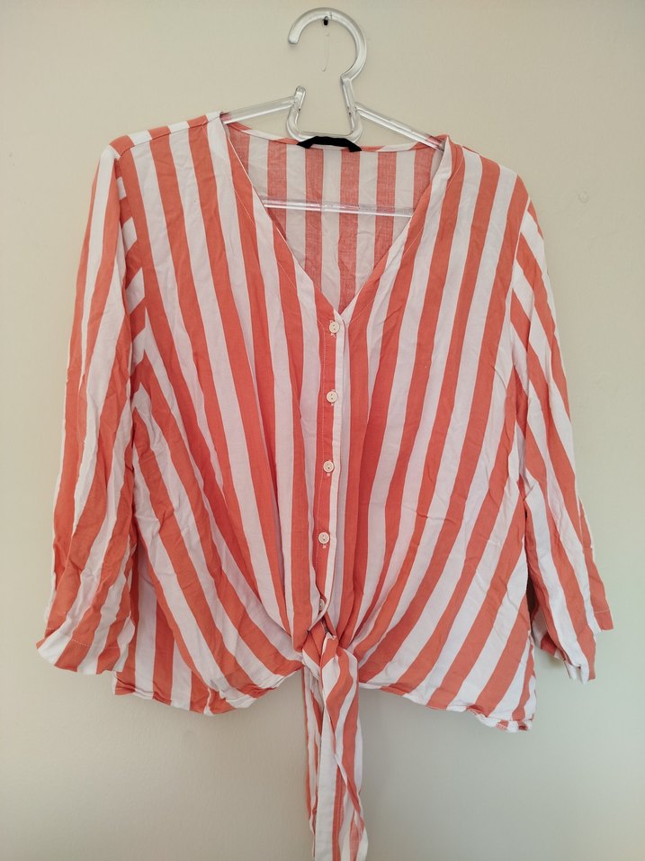 Düğmeli, V yakalı, uzun kollu ve bol kesim kadın gömleği. Pastel kırmızı çizgili, sentetik kumaştan, bağlamalı detaylı midi boyda.