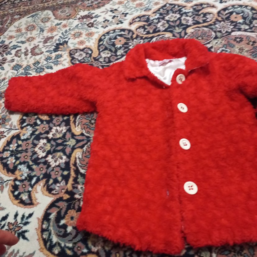 Düğmeli, uzun kollu kırmızı güzel bir çocuk montu