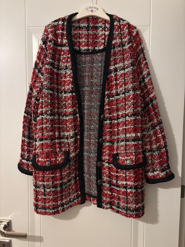 Düğmeli Kırmızı Desenli Midi Kadın Ceket