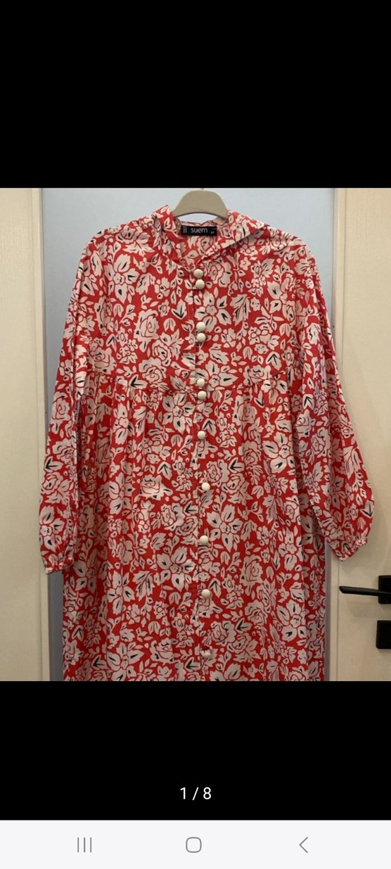 Düğmeli, yakalı ve uzun kollu kırmızı desenli, bol kesim kadın elbisesi. Bohem ve vintage tarzı sevenler için renkli ve rahat bir model.