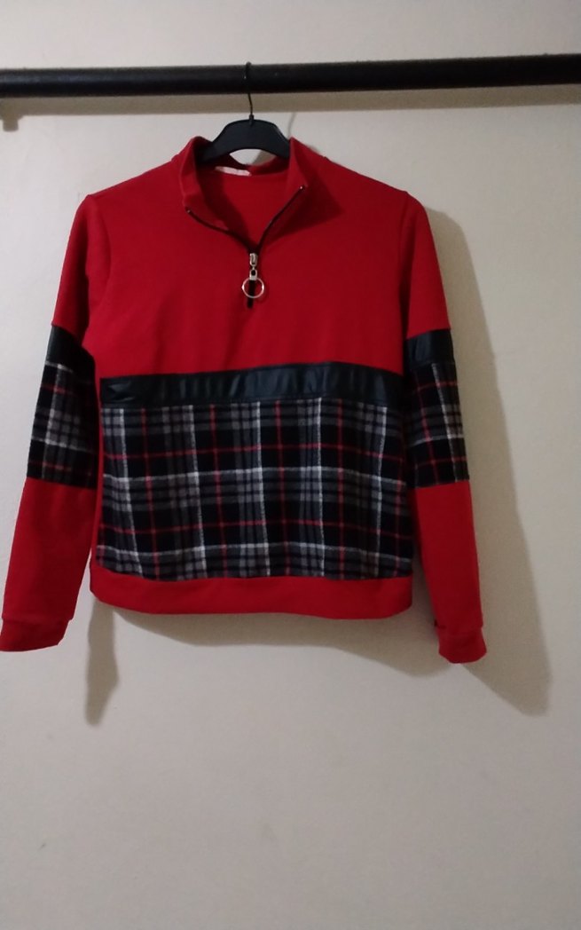 Düğmeli, uzun kollu, yuvarlak yakalı, kırmızı ve ekose desenli renkli sweatshirt. Bol kesim ve kısa boy ile rahat kullanım sağlar.