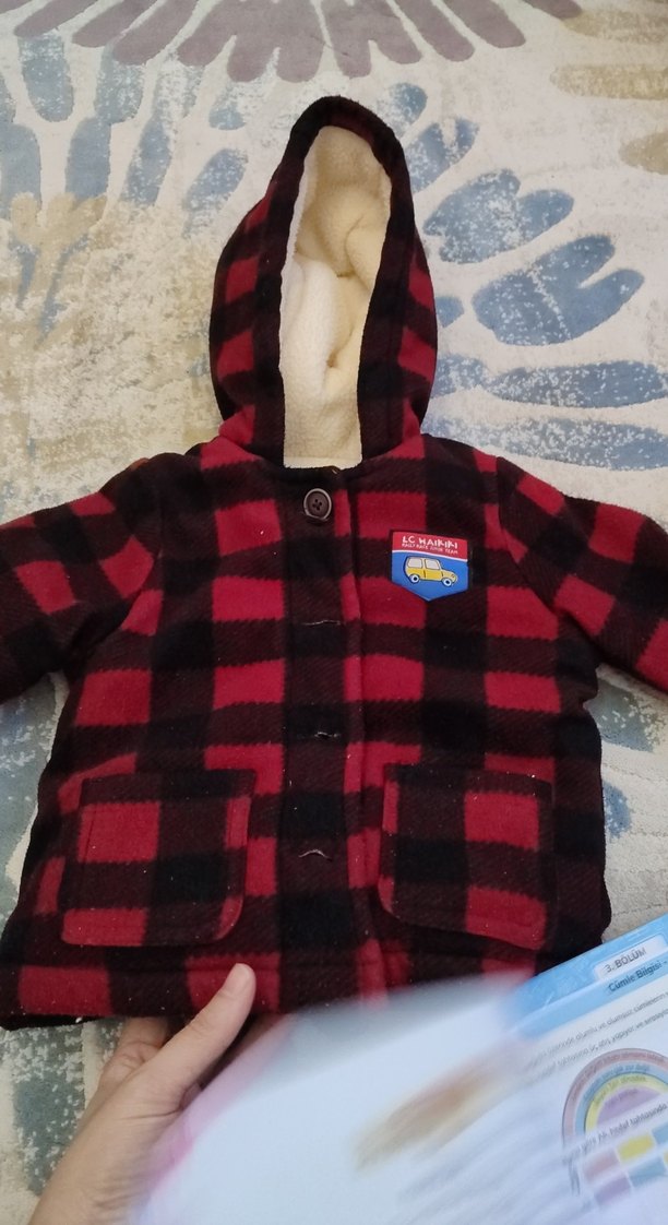 Düğmeli, kapüşonlu erkek çocuk kabanı, kırmızı siyah ekose desene sahip. Yumuşak ve sıcak kumaştan, sokak stili için uygun.
