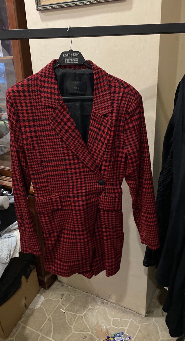 Düğmeli, kırmızı ekose desenli kadın blazer, normal boyda ve uzun kolludur. Günlük kullanıma uygundur.