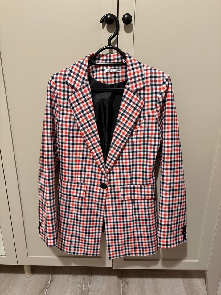 Kadınlar için düğmeli, kırmızı ekose desenli, normal uzunlukta ve uzun kollu blazer ceket. Sentetik kumaştan, ofis ve günlük stil için uygundur.