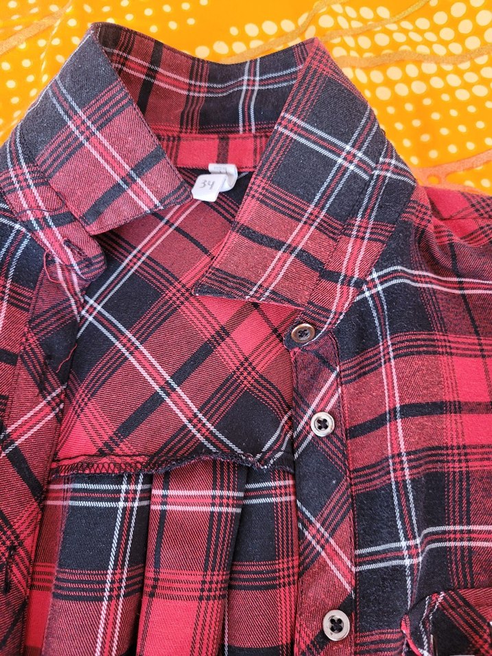 Düğmeli, kravat yaka ve uzun kollu kırmızı ekose desenli kadın gömleği. Yumuşak kumaştan, bol kesim ve günlük kullanıma uygun.