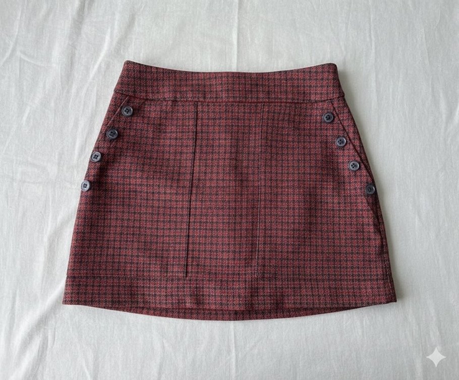 Düğmeli, kırmızı ekose desenli, sentetik kumaştan yapılmış, oturan midi etek. Birkaç kez kullanıldı.