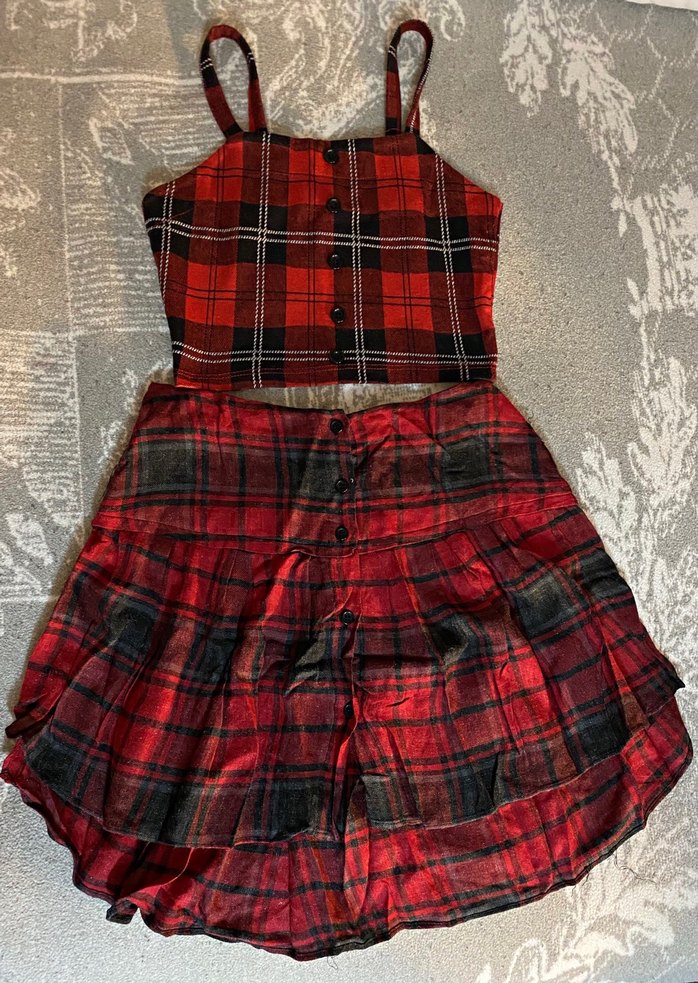 Düğmeli, kırmızı ekose desenli, bol kesim mini etek.Zara markadır bedeni xs’dur fakat beli boldur.Ben 47kiloyum fakat fotoğrafta gösterdiğim gibi beli bol geliyor o yüzden hiç giyemedim yanında üstü de ben ekledim takım olsunlar diye üst zara değildir.Geri iade yoktur.