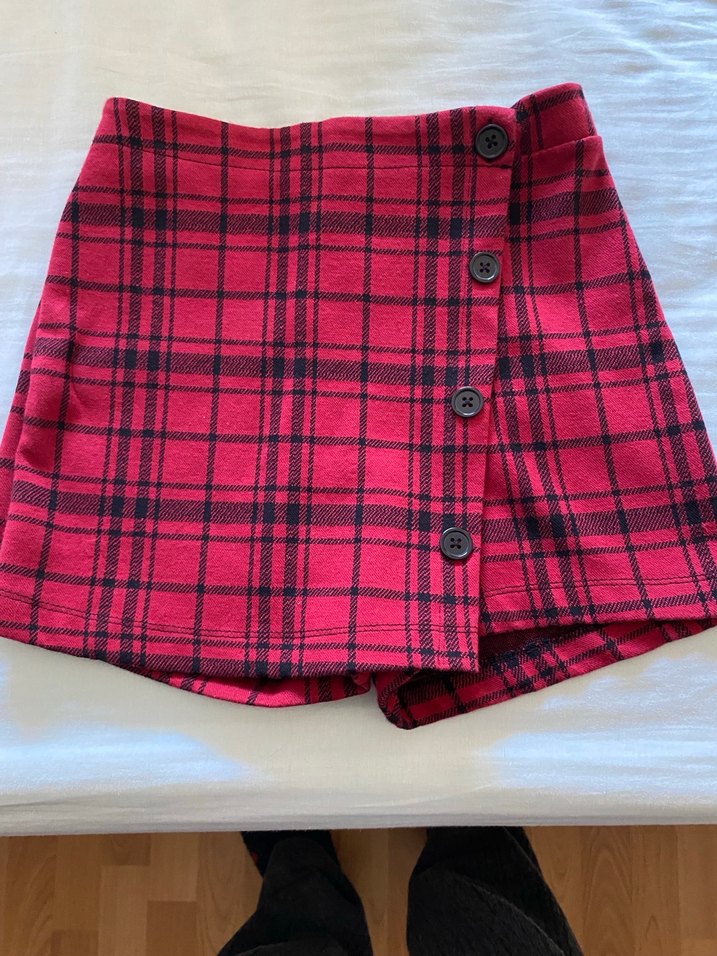 Düğmeli, koyu kırmızı ekose desenli, sentetik kumaştan yapılmış, sokak tarzı için uygun, fitted mini etek. 9-10 yaş, koton. Bir kez giyildi tertemiz sorunsuz