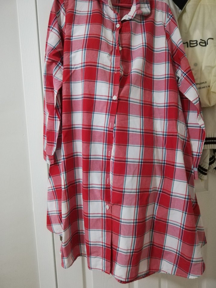 Düğmeli, yakalı, uzun kollu, kırmızı ekose desenli gömlek. Bol kesim mevlana kesim dedikleri 46 beden