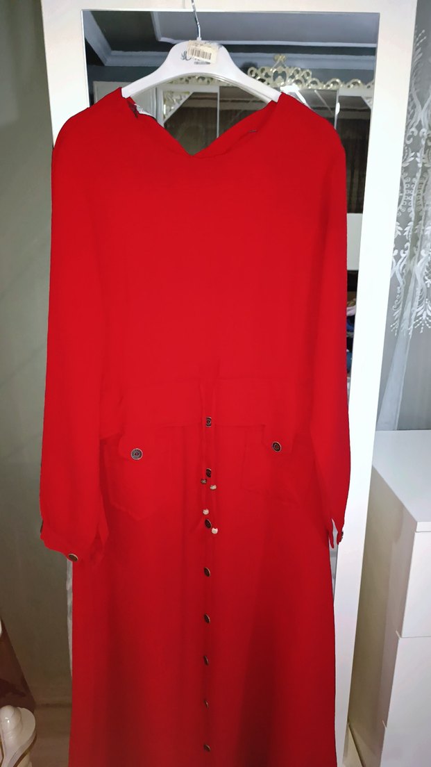 Parlak kırmızı renkte, düğmeli ve uzun kollu elbise. Notlu yakası ve bol kesimi ile günlük kullanıma uygun.