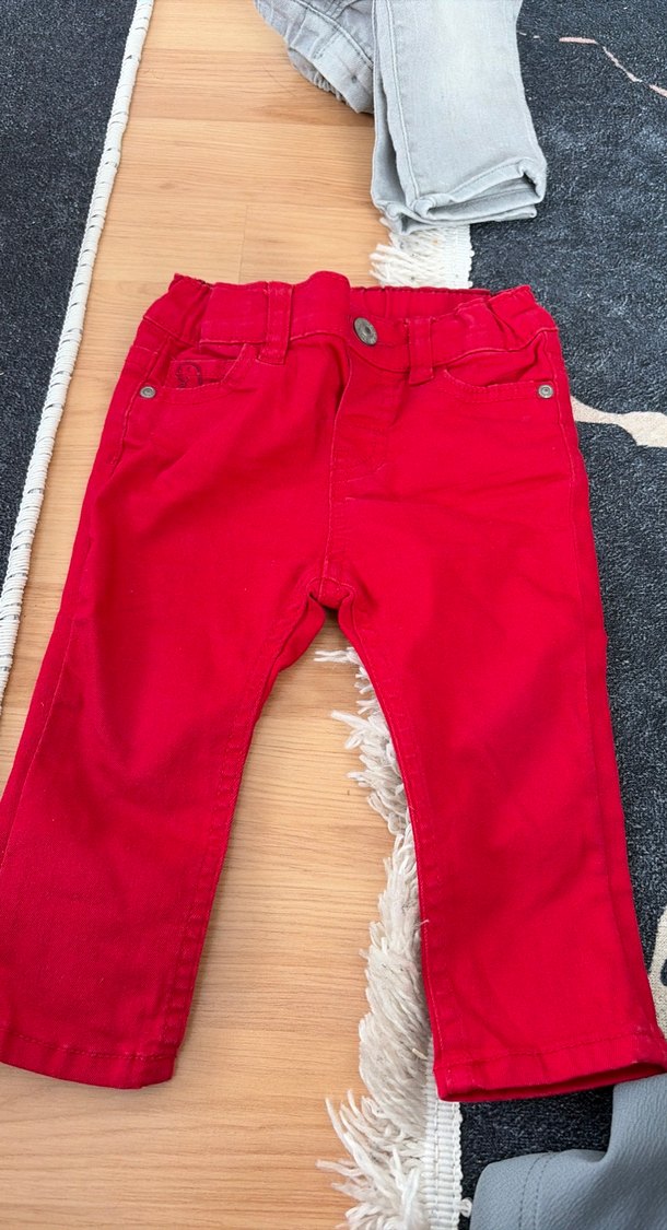 Düğmeli, kırmızı renkli, erkek çocuklar için kot pantolon. Rahat ve dayanıklı kumaşıyla günlük sokak tarzına uygun.