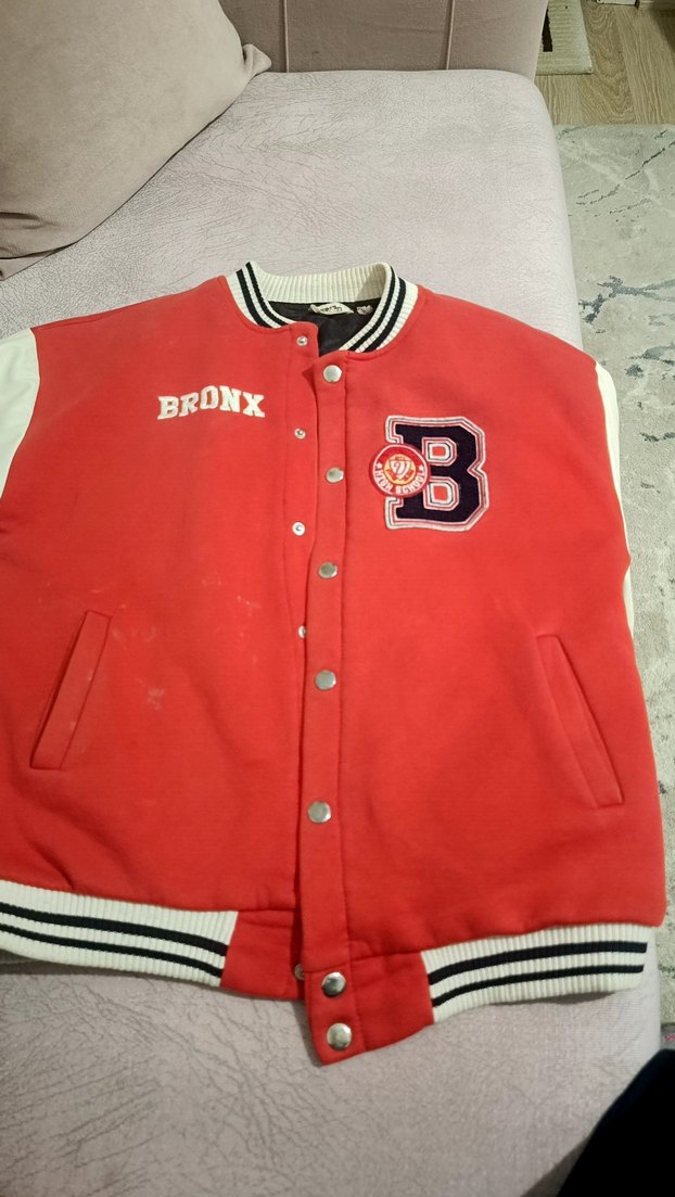 Düğmeli, fitted kesim kırmızı erkek çocuk mont. 'BRONX' baskılı, renkli desenli, yumuşak ve sıcak kumaştan yapılmıştır. yenidir herhangi bir deforme yok.