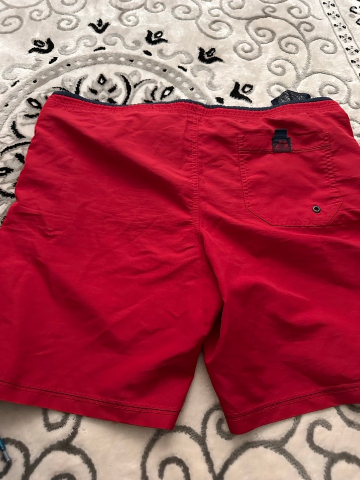 Düğmeli arka cepli, koyu kırmızı renkli, bol kesim erkek midi şort. Plaj ve günlük sokak tarzı için uygundur.