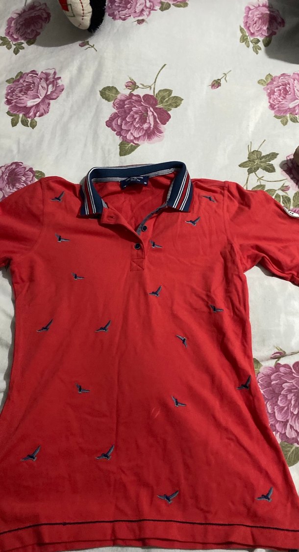 Fitted kesim kırmızı erkek polo yaka tişört, kısa kollu ve düğmeli. Tekstil kumaştan, küçük kuş desenleriyle günlük rahat kullanım için uygun.
